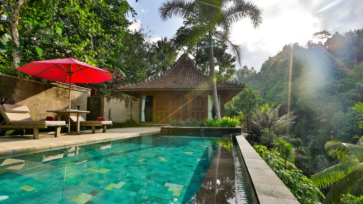 Suspended above the sacred valley, this 194 sqm Rumah Kudus–style villa blends Javanese heritage with contemporary luxury. A serene bedroom opens to a private infinity pool and sun deck, offering uninterrupted views of Ubud’s emerald jungle.
